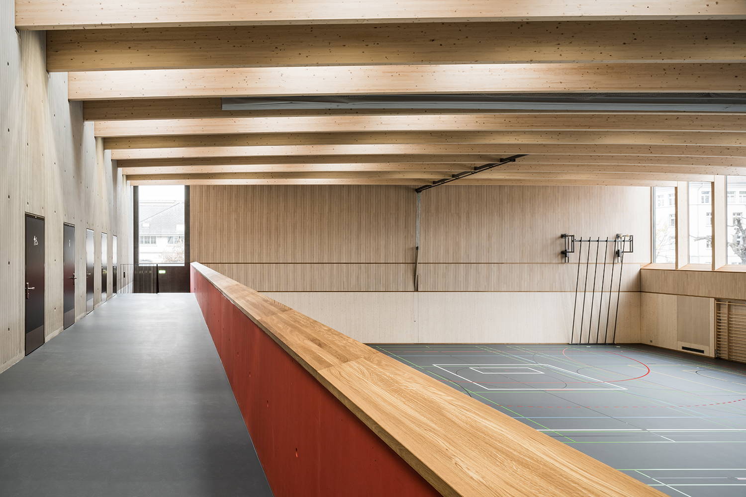 Die Hallenkonstruktion ist als Holzbau konzipiert und erfüllt den Minergie-A-ECO Standard. Der Annextrakt mit Garderoben, Geräte- und Technikräumen ist in Stahlbeton ausgeführt.